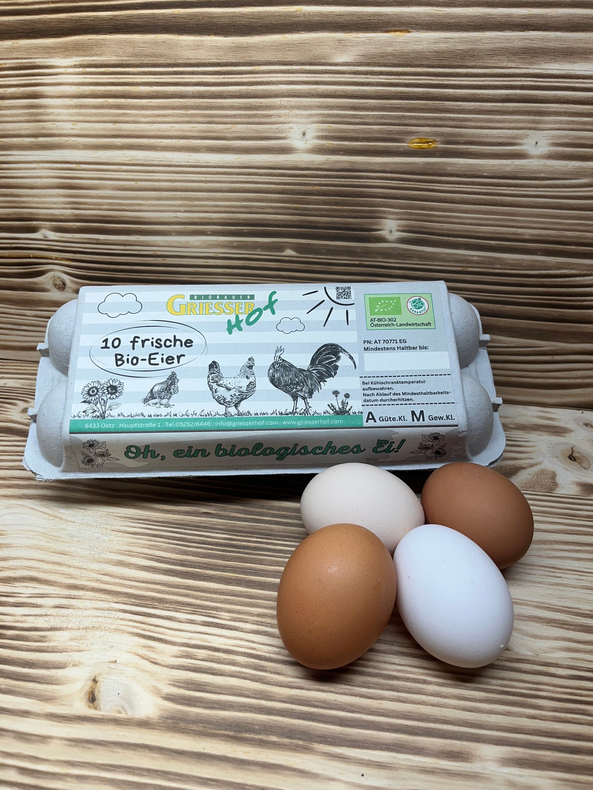 Die Hühner bei uns am Hof genießen das ganze Jahr über Auslauf und fühlen sich wohl beim Sandbaden in der Sonne. In der Biohaltung wird komplett auf Farbstoffe im Futter verzichtet, wodurch das Dotter etwas heller ist als bei herkömmlichen Eiern.